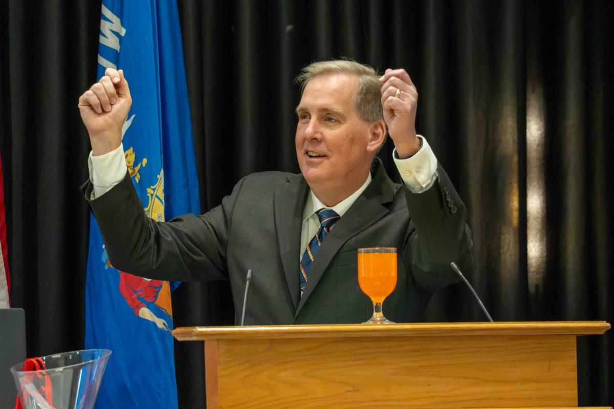 Half-filled glasses and romcom references: How WTBA’s Baas drove home importance of transportation funding at Concrete conference